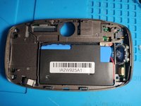 The RF module is now held by a clip at the bottom, a small round locator pin on the lower right, and a connector at the top edge, underneath. Use a spludger at the top edge to pry the RF module connector loose. It will pop off.
