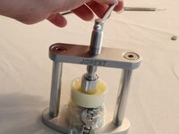 When the top die is has almost reached the watch, hold it with your left hand to keep it in place. Continue to turn the lever until the top die has gone as far as it can go.