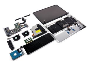 Clockwise from top left: Logic board, heat sink, display, unibody upper case, battery, hard drive, speakers. Fans, RAM, and optical drive are in the center.