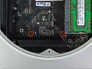 Remove the two 2.6 mm T6 Torx screws securing the AirPort/Bluetooth board to the logic board.