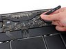 The battery is made up of six distinct cells, four of which are adhered to the upper case. Use great care in prying these four cells up from the case—bending or puncturing them can damage their performance, and may release hazardous chemicals. Only use plastic tools when prying.