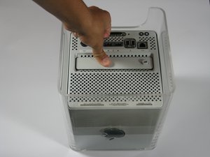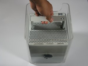 Release the back handle of the PowerMac. Slowly pull out the cube by holding the end of the handle. Watch for any parts that may become entangled with the outer case.