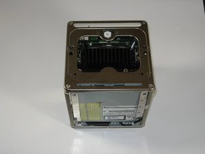 If the Cube has an Airport card installed, it must be removed. This can be accomplished by disconnecting its antenna, and pulling gently on the clear plastic tab on its end. The bracket it is contained in must be unlatched from the frame and rotated out of the way to get to the two optical drive mounting screws beneath it.