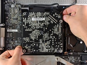 Next, while holding the new hard drive cables against the GPU heat sink, lower the bottom edge of the logic board back down into the outer case.
