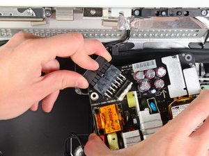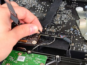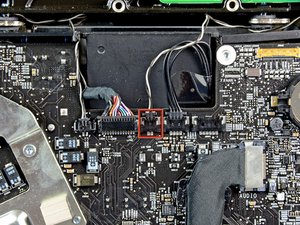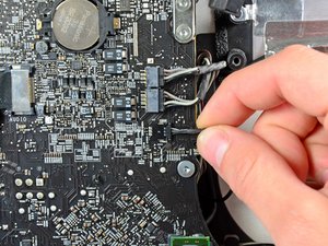 Pull the CPU fan/ambient temperature sensor connector toward the bottom left edge of the iMac and out of its socket on the logic board.