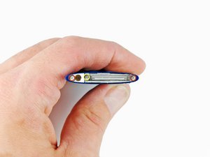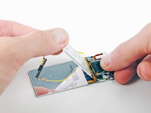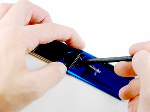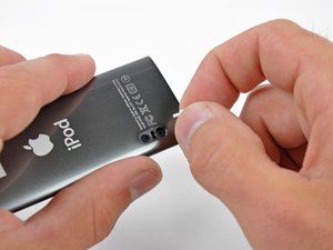 From the top of the iPod, insert a metal spudger between the outer case and the battery to remove the adhesive that holds the battery in place.