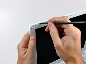 Insert the flat end of a spudger perpendicular to the face of the display into the gap between the front and rear bezels near the upper left corner of the display.