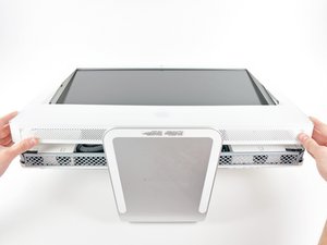 Lift the front bezel off the rear case and rotate it away from the bottom edge of the iMac, minding the camera and microphone cables still attached to its upper edge.