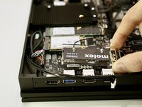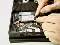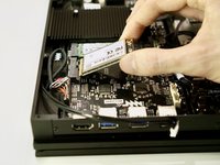 Pull the two metal tabs holding the WiFi card away from the mPCIe socket. The WiFi card will spring up on its own.