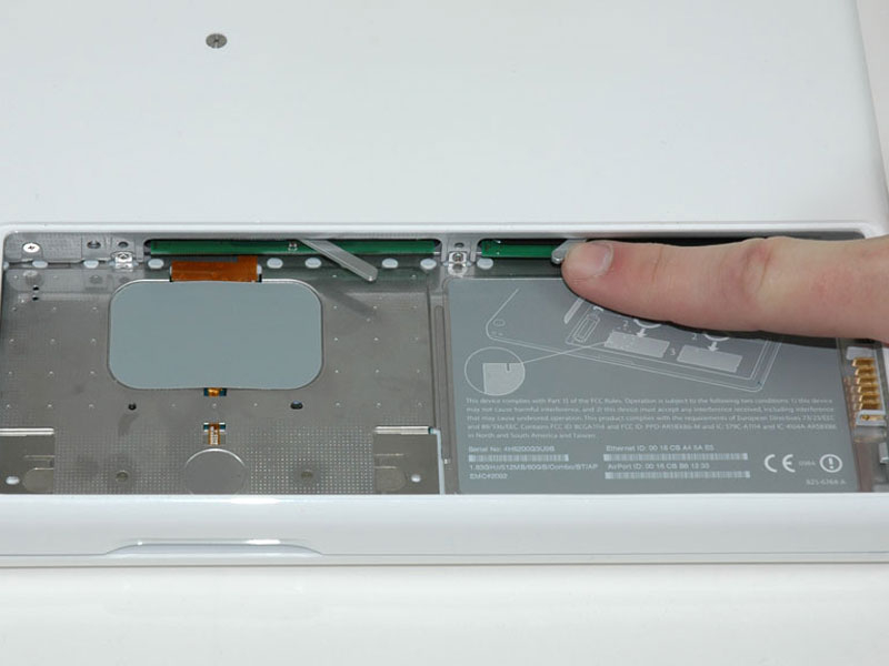 Accessing the RAM in this computer is straightforward and requires minimal disassembly. Two RAM slots allow up to 2 GB of PC2-5300 RAM.