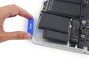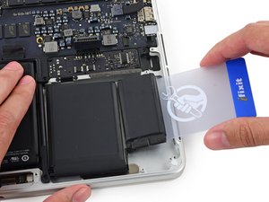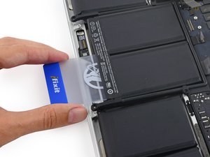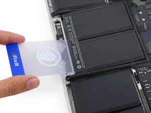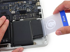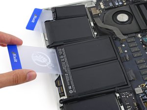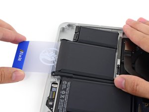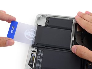 Pull the card back out and insert it about an inch between the right-center battery cell and the upper case, separating the adhesive between the cell and case.