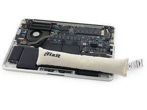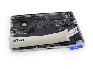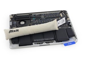 Reheat the iOpener and reapply it, this time to the left-most battery cells.