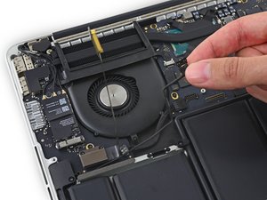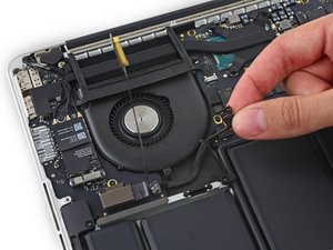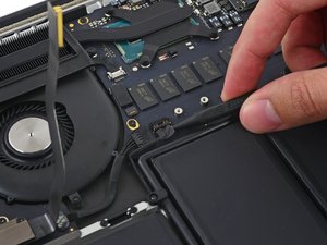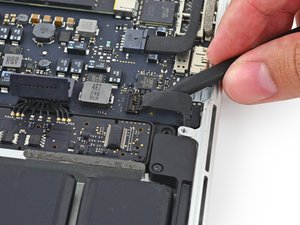Carefully tuck the tip of a spudger under the right speaker cable near the connector and lift it up out of its socket on the logic board.