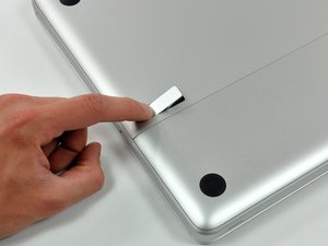 Grab the translucent plastic tab and pull the battery up and out of the Unibody.