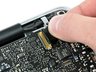 Grab the plastic pull tab secured to the display data cable lock and rotate it toward the DC-in side of the computer.