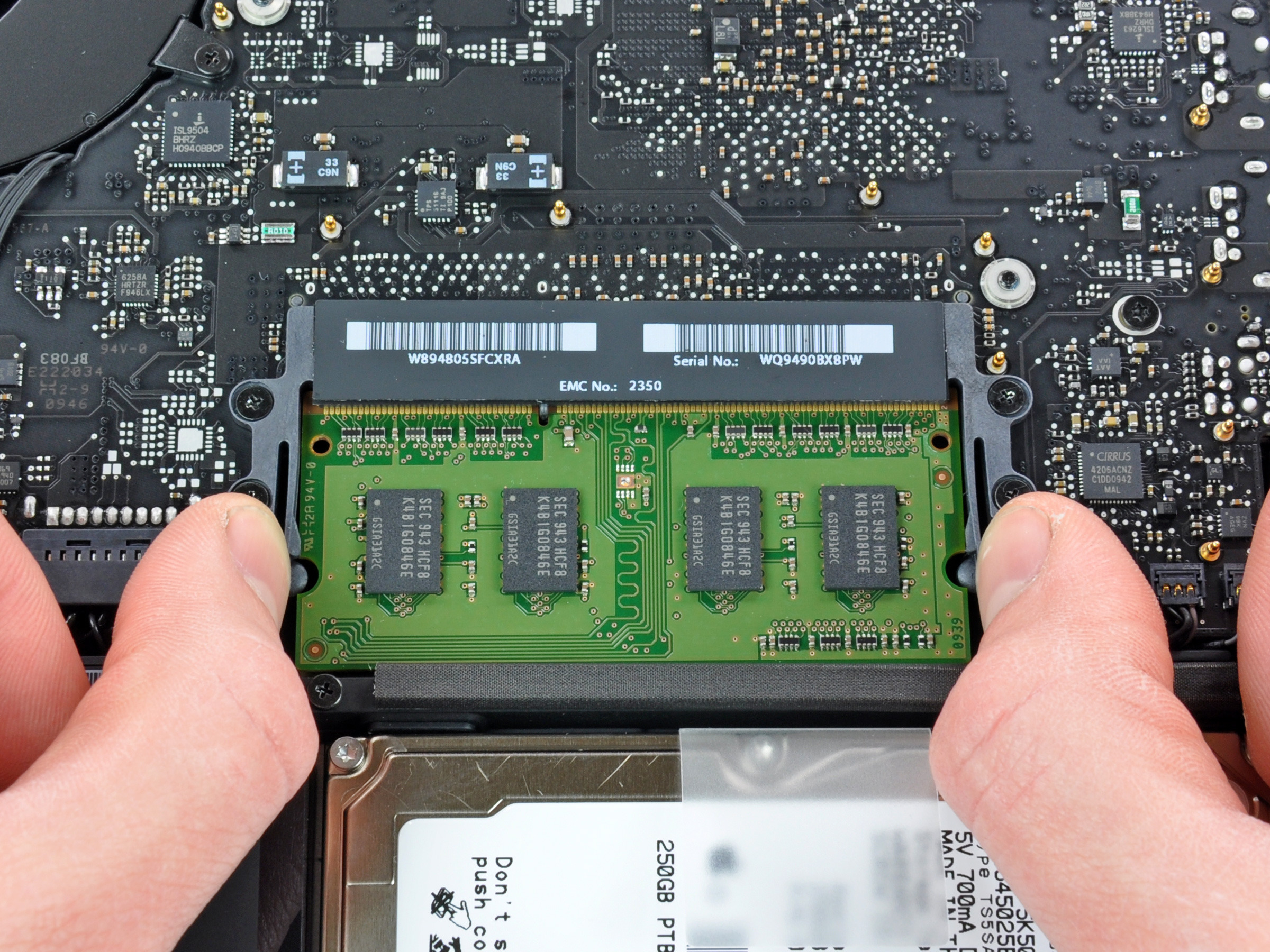 Release the tabs on each side of the chip by simultaneously pushing each tab away from the RAM.