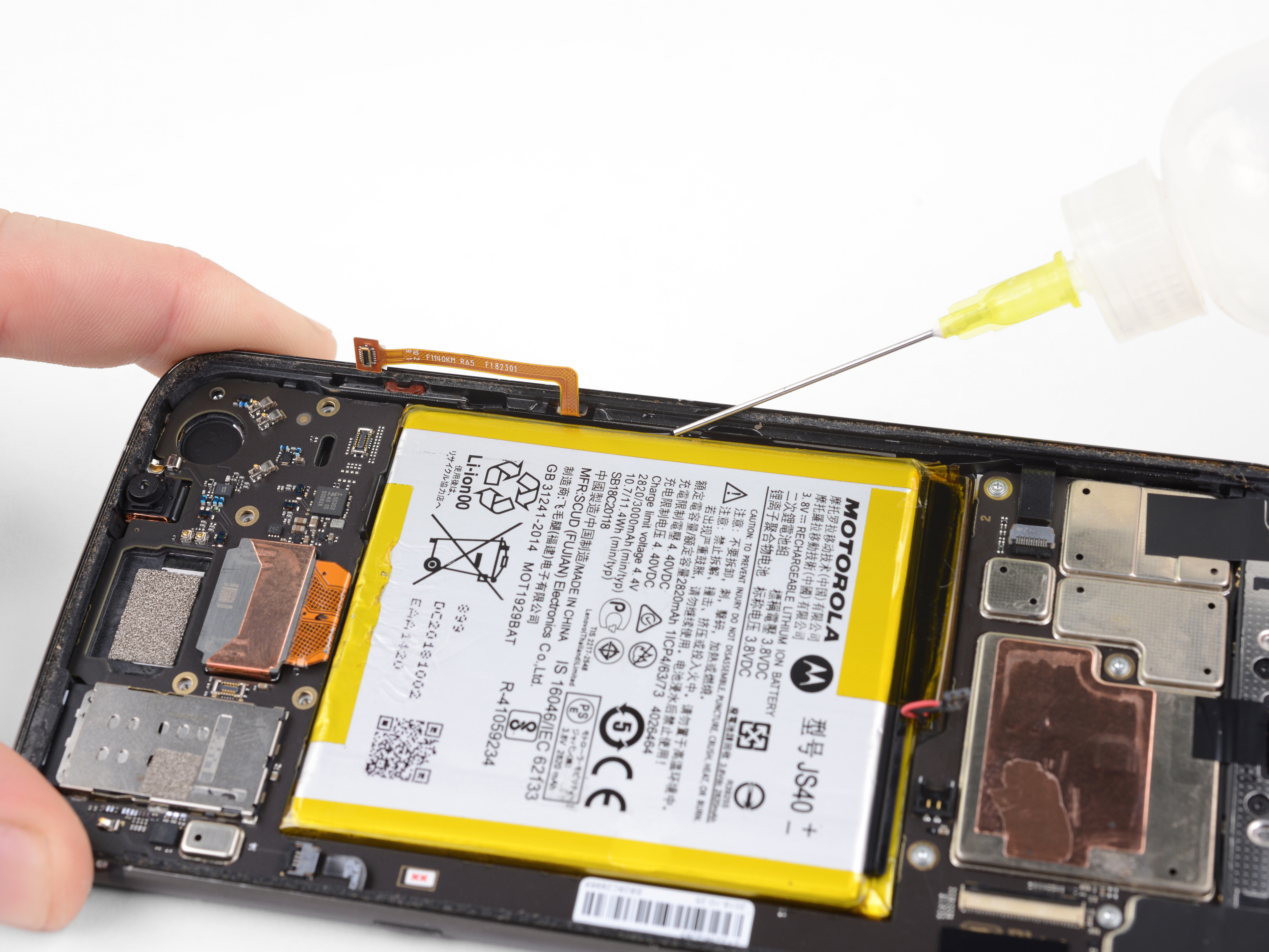 Use a pair of tweezers to remove the two black pieces of tape securing the battery.