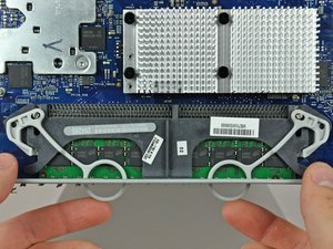 Tuck the RAM arms into the iMac so they rest on the perforated metal grille along its lower edge.