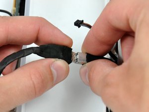 Disconnect the DC-in cable by simultaneously depressing both locking arms and pulling its connector away from the socket on the logic board toward the top of your iMac.