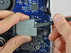 Use the flat end of a spudger to pry both antenna cable connectors up off the AirPort/Bluetooth board.