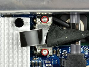 Remove the two 5 mm T6 Torx screws securing the display data cable to the logic board.