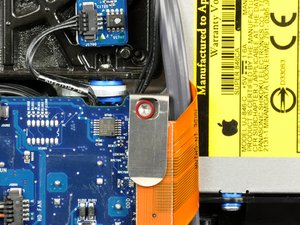 Remove the 7 mm T10 Torx screw securing the optical drive flex cable mounting bracket to the logic board.