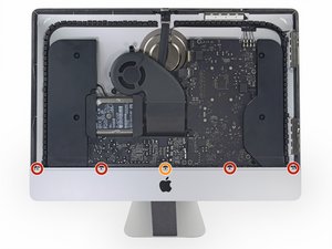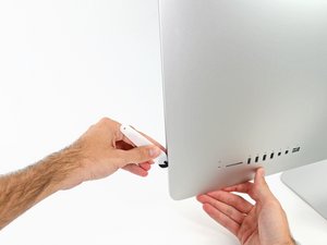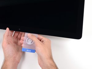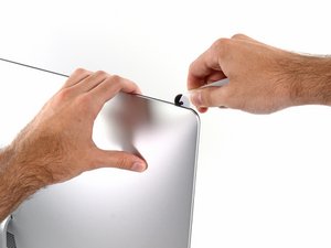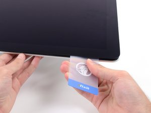 Starting from the top right corner of the iMac, wedge a plastic card between the display and frame.