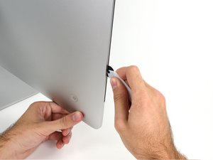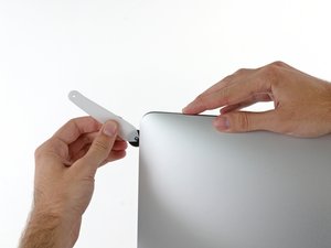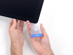 Starting from the top right corner of the iMac, wedge a plastic card between the display and frame.