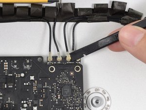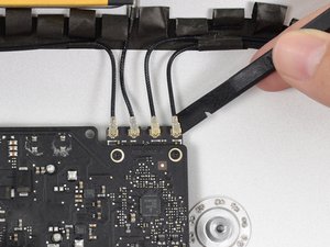 Use the flat edge of a spudger to disconnect each of the four antenna connectors from the AirPort/Bluetooth card.