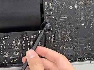 Squeeze the DC power cable connector tab and pull it straight out of its socket on the back of the logic board.