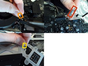 Almost there! Time to really go wireless by disconnecting the three WiFi and bluetooth antennas. These are tiny snaps so pull gently upward. Also, sneaking in from underneath, you'll find the iSight camera cable. Unplug it. This is one to look out for when you reinstall the logic board.