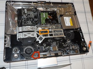 You can see parts of the graphics card highlighted in orange. The GPU is on the right and the dedicated heat fins are on the left, located just "downwind" of the CPU heat fins.