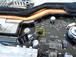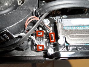 This position on the logic board has three closely-spaced connectors for the power button, ambient temp sensor, and the CPU fan. Unplug them.