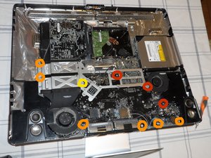 This guide will illustrate disconnecting all cables from the logic board, removing all retaining screws from the logic board, removing the logic board, and replacing the video card.