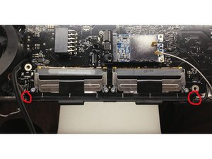 Remove the two T-9 (2mm x 7mm) screws from the bottom right and left corners of the RAM slots that secure the black plastic bracket to the frame.