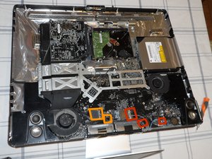 When the VRAM on my early-2009 24" iMac went bad, I feared I might need to trash the machine. Some sources suggested the video card was soldered to the logic board but that may only be true of the base-model iMac. The ones with the nVidia and ATI upgrades are repairable/upgradable as illustrated in this guide.