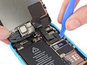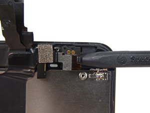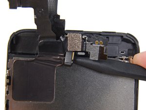 Using the pointed end of a spudger, gently pry the earpiece speaker contact cable up, to separate this portion of the camera and sensor cable from the adhesive below.