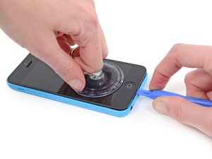 With a plastic opening tool, begin to gently pry the rear case down, away from the display assembly, while you pull up with the suction cup.