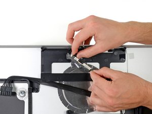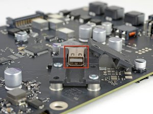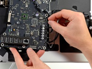 Interestingly enough, the Thunderbolt cable that routes into the display also plugs into a standard Thunderbolt socket on the logic board. Apple could have just soldered the cable wires to the board, but instead chose to implement a cover that prevents the cable from being detached from the logic board's Thunderbolt socket.