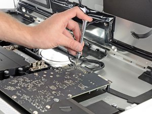 A few more T10 Torx screws bite the dust at the hand of our bit driver kit, and the logic board is detached.