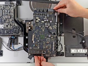Stop—it's connector time! We remove a plethora (that's right, plethora, we're using our five dollar words) of connectors from the logic board, leaving only the brains behind the Thunderbolt port between us and the display's control center.