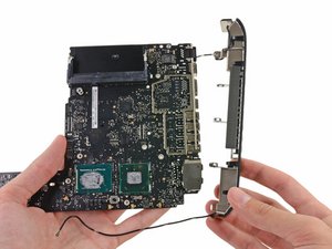 A series of screws and tightly wrapped antenna cables secure the rear I/O panel shield to the logic board.