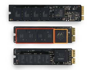 It appears that the 2013 MacBook Air 11" uses the same PCIe-based SSD that we dug out of the 13" model. However, this particular drive is a SanDisk module, fitted with components from three different manufacturers: