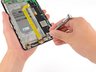 Our trusty spudger makes quick work of the copper film found beneath the battery.