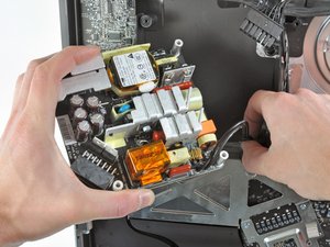 Removing the power supply requires disconnecting the AC inlet cable from the logic board.