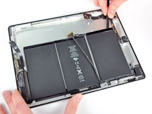 • Lifting off the LCD exposes the iPad 2's battery; A 3.8V, 25 Watt-hour unit. That's just a hair more than the original iPad's 24.8 Watt-hours, so any improved battery performance can be attributed to software and other hardware improvements.