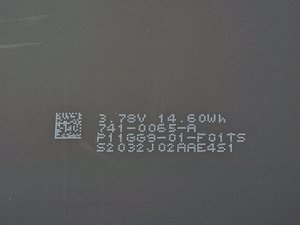 Each separate cell lists its rating of 3.78 volts and 14.60 watt-hour. They're graced with some more matrix barcode tags and wonderful inscriptions that read 741-0065-A P11GG9-01-F01TS. Swoon.